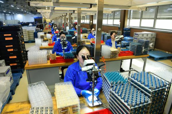 Employees check auto components at a German funded high-tech company in Suzhou, Jiangsu province.(JI HAIXIN/FOR CHINA DAILY)