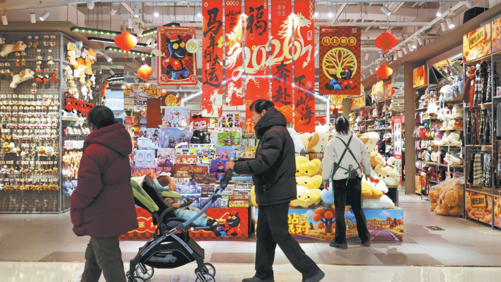 Shoppers walk past a supermarket stocked with Chinese New Year goods in Lianyungang, Jiangsu province, on Jan 9. (GENG YUHE/CHINA DAILY)