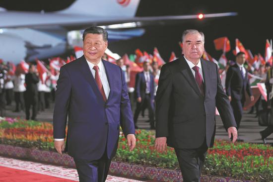 Xi arrived in Dushanbe, the capital of Tajikistan, on Thursday night after attending the 24th Meeting of the Council of Heads of State of the Shanghai Cooperation Organization in Astana, Kazakhstan.