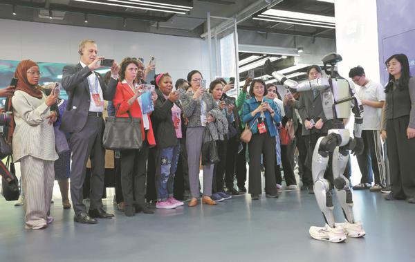 Foreign delegates attending the Global Leaders' Meeting on Women take photos of a humanoid robot on Tuesday during their visit to the Robot World — a comprehensive robot exhibition center in the Beijing Economic-Technological Development Area, also known as Beijing E-Town. (ZOU HONG/CHINA DAILY)
