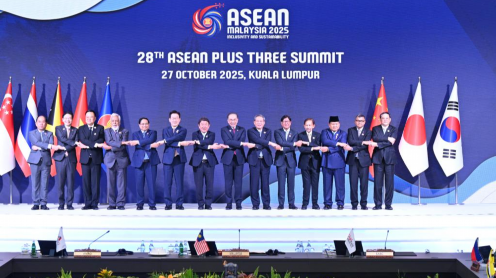 Chinese Premier Li Qiang poses for a group photo while attending the 28th ASEAN Plus Three Summit in Kuala Lumpur, Malaysia, October 27, 2025. (Photo/Xinhua)