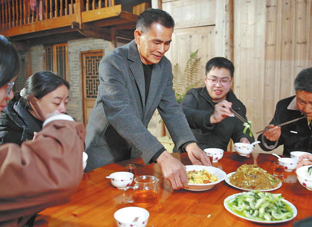 Yang Shangbiao presents guests with dishes in Xiapingfeng village on Jan 15. (PROVIDED TO CHINA DAILY)