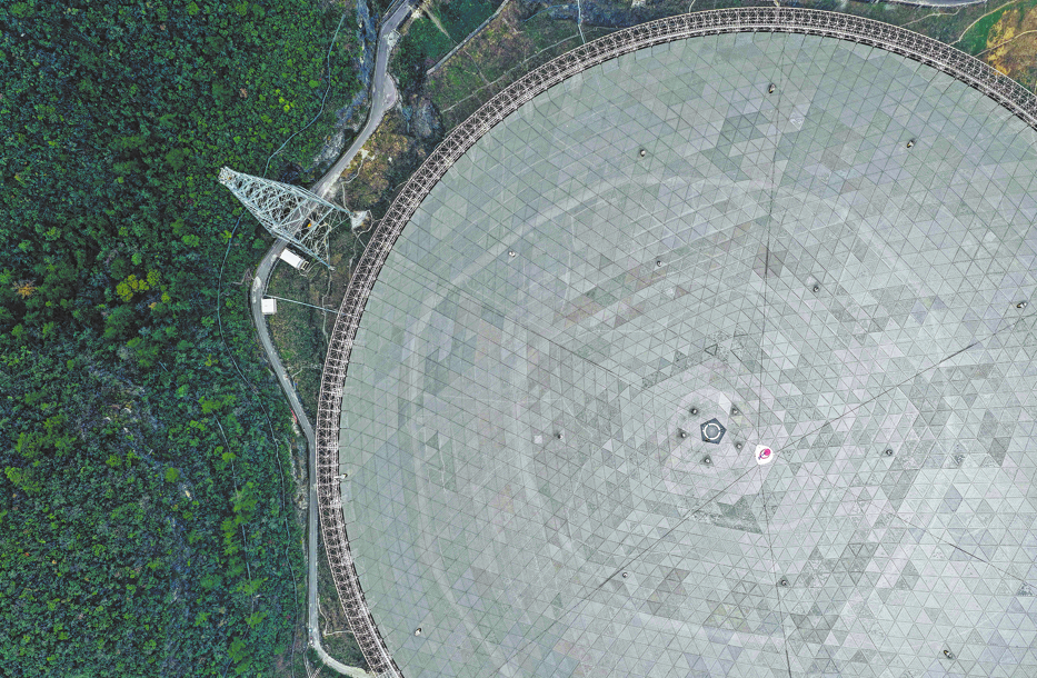 An aerial photo taken on Friday shows China's Five-hundred-meter Aperture Spherical radio Telescope, or FAST, under maintenance, in Guizhou province. (Ou Dongqu/Xinhua)