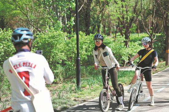 Cyclists pose for photos to capture a moment on a greenway at Wanghe Park in Beijing's Chaoyang district on April 16. (Photo by Wang Fei/For China Daily)