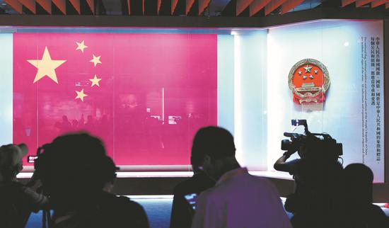 Exhibits include the national flag that flew in Beijing's Tian'anmen Square on the day the National Security Law for Hong Kong was implemented, an official replica of an oil painting that depicts the ceremony at the founding of the People's Republic of China in 1949, and some models of China's aerospace and deep-sea scientific facilities.