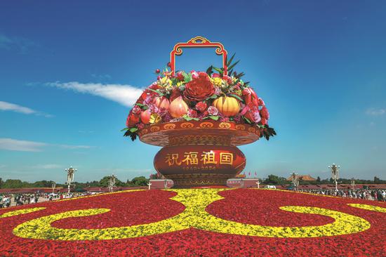 The basket and the other 10 flower terraces bearing good wishes to the country and showing the nation's achievements over the past 75 years will be displayed along Chang'an Avenue for the upcoming National Day holiday, which will be held from Oct 1 to 7, the Beijing Municipal Forestry and Parks Bureau announced on Wednesday.