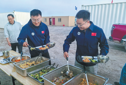 Geological workers have meals at the Xining field support base in Qinghai province. (WEI ZHIGANG/FOR CHINA DAILY)