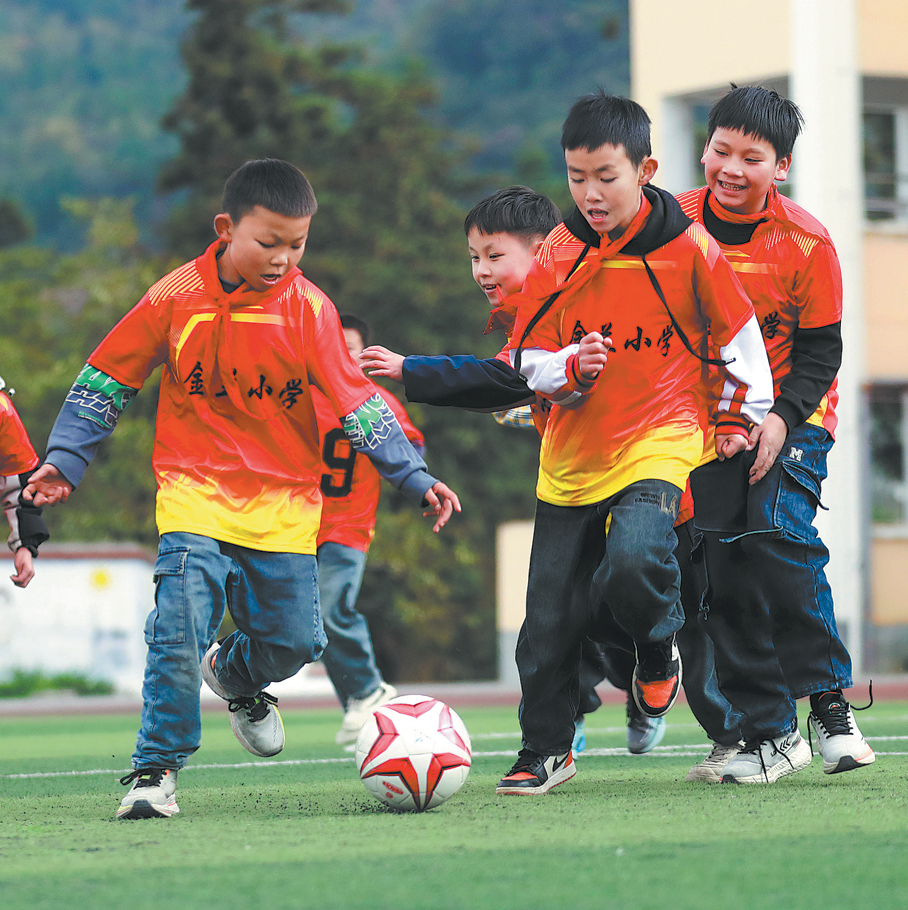 Students take part in a soccer scrimmage at a primary school in Jinlan town, Guizhou province, on Wednesday. A new guideline requires all primary and secondary school students to have at least two hours of daily physical activity by 2027. (ZHOU XUNCHAO/FOR CHINA DAILY)