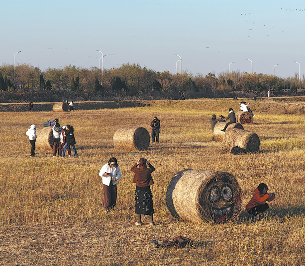 Visitors take photos in a field after the rice harvest in Dongying on Wednesday. YANG YANG/FOR CHINA DAILY