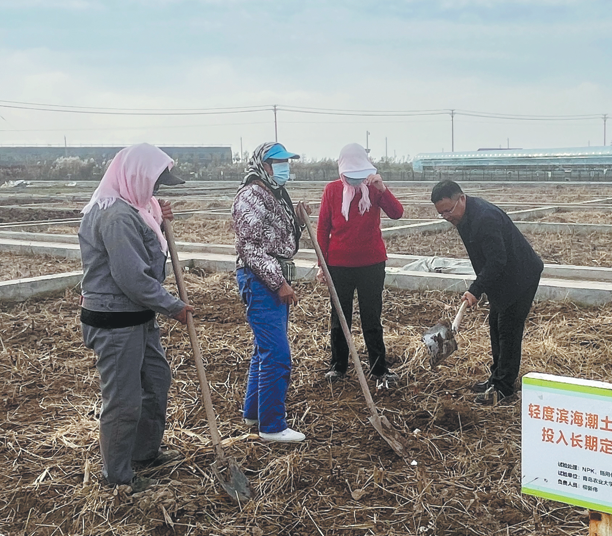 Liu Xinwei (right), a professor at Qingdao Agricultural University, works with villagers on soil improvement trials at an experimental base in Dongying, Shandong province, on Nov 6. GAO XIAOLU/FOR CHINA DAILY