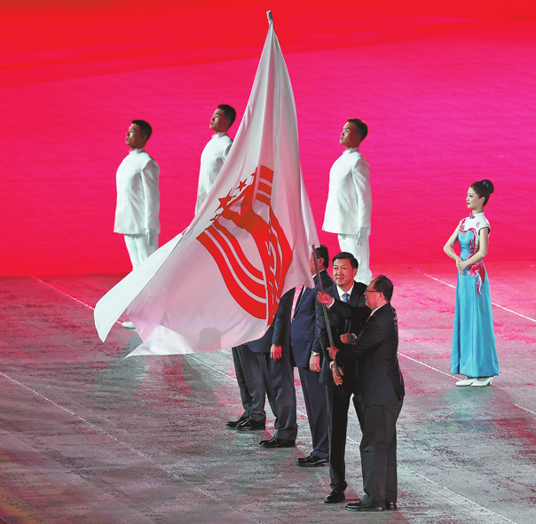 The National Games flag is handed over from Guangdong-Hong Kong-Macao to Hunan province, which will host the 16th National Games in 2029. (AN LINGJUN/FOR CHINA DAILY)