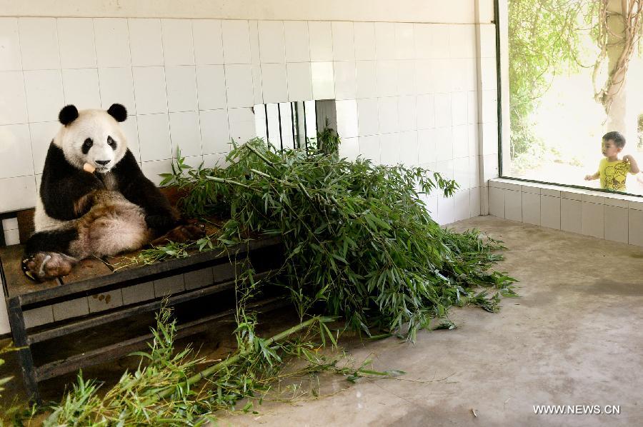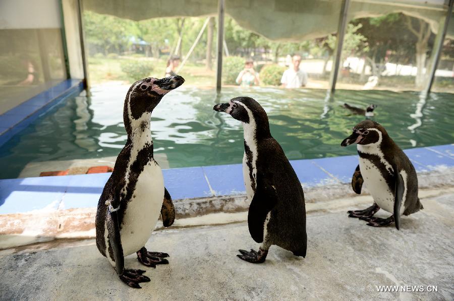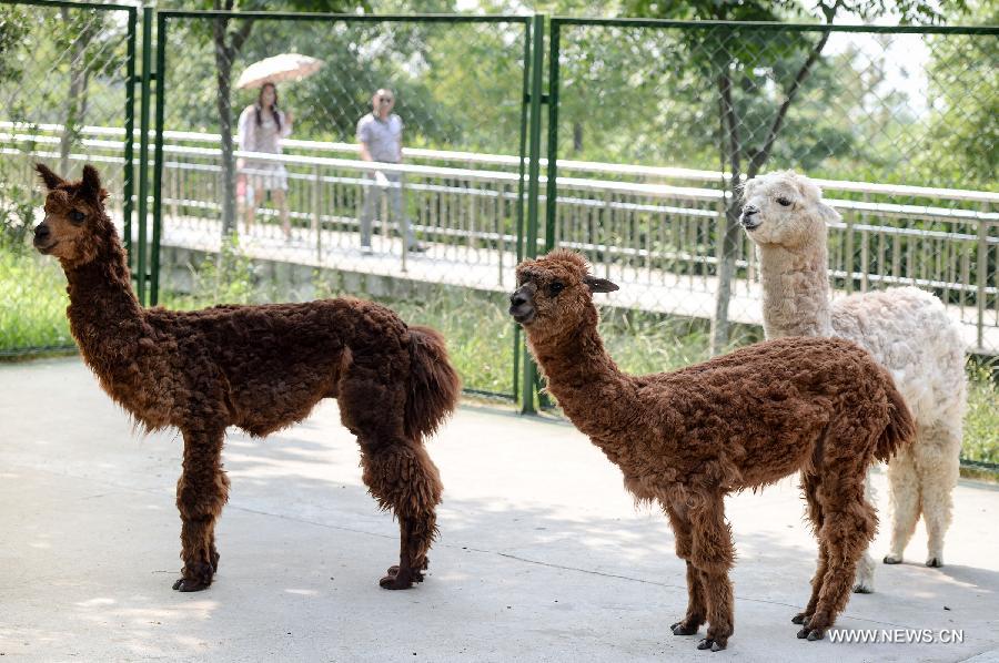 Photo taken on June 10, 2014 shows alpacas sheared for cooling off at Hefei Zoo in Hefei, capital of central China's Anhui province. The temperature reached a high of 30 degrees Celsius recently. (Xinhua/Guo Chen)