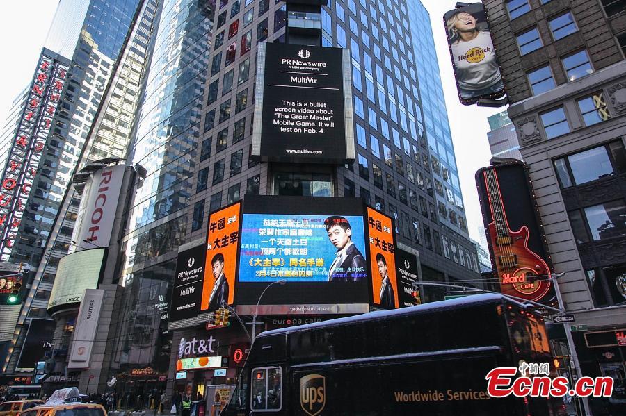 Advertisement for a newly released Chinese mobile game is seen on the advertising screen in New York City's Times Square, Feb 3, 2014. Pop-up ads, with random words or phrases, seem to enjoy an increasing favor in China’s business market, appearing in TV programs and large LCD screens in several cities. [Photo: China News Service/Zong He]