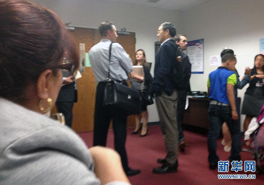 Yang Xiuzhu's lawyer Vlad Kuzmin (L,2nd ) waits prior to Yang's hearing in a New York immigration court in New York, the United States, June 9, 2015. The first hearing in the trial of China's most wanted economic fugitive Yang Xiuzhu took place in a New York immigration court on Tuesday. Last month, a source of U.S. Immigration and Customs Enforcement (ICE) confirmed that Yang, who went into hiding after being sought after by anti-corruption investigators in China, has been detained in the United States. The ICE accused Yang of "violating the terms of the Visa Waiver Program," and asked the immigration court to deport her to China. Yang is one of the 100 Chinese nationals suspected of corruption who are believed to have fled abroad. She used to serve as vice mayor of Wenzhou, a coastal city in Zhejiang province. When investigators started looking into her activities in 2003, she and her family fled China. Investigators have found evidence that Yang had accepted 253 million yuan (about 41 million U.S. dollars at current price) in bribes. She was subject to an Interpol red notice. (Photo/Xinhua)