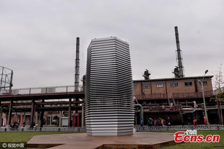 A "Smog Free Tower" by Dutch designer Daan Roosegaarde undergoes tests in Beijing, Oct. 20, 2016. The seven-meter-high metal structure is said to be the world's largest air purifier with the capacity to scrub 30,000 cubic meters of air an hour. (Photo/CFP)