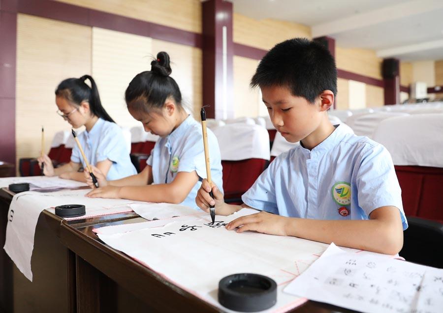 Students at Nankai Primary School in Southwest China's Chongqing practice calligraphy of oracle-bone inscriptions on May 8, 2018. A special course is taught at the school to introduce the ancient language to the younger generation, taking them down memory lane to the Shang Dynasty (c.16th century-11th century BC), when the inscriptions were believed to be made. (Photo/Xinhua)