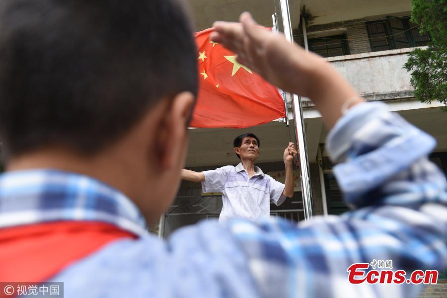 Xu Yuhua, 55, leads sole pupil Fan Yihao to raise the national flag at the elementary school in Huaxi Village, Masha Town, East China’s Fujian Province. Fan has been teaching for 35 years in many elementary schools in Masha Town. The Huaxi school had more than 100 students and a dozen teachers at its peak. But as many children have departed to study in cities where their parents work, there’s now only one pupil and one teacher left at the school. Fan said he will continue teaching elsewhere, as his skills are required. (Photo/VCG)