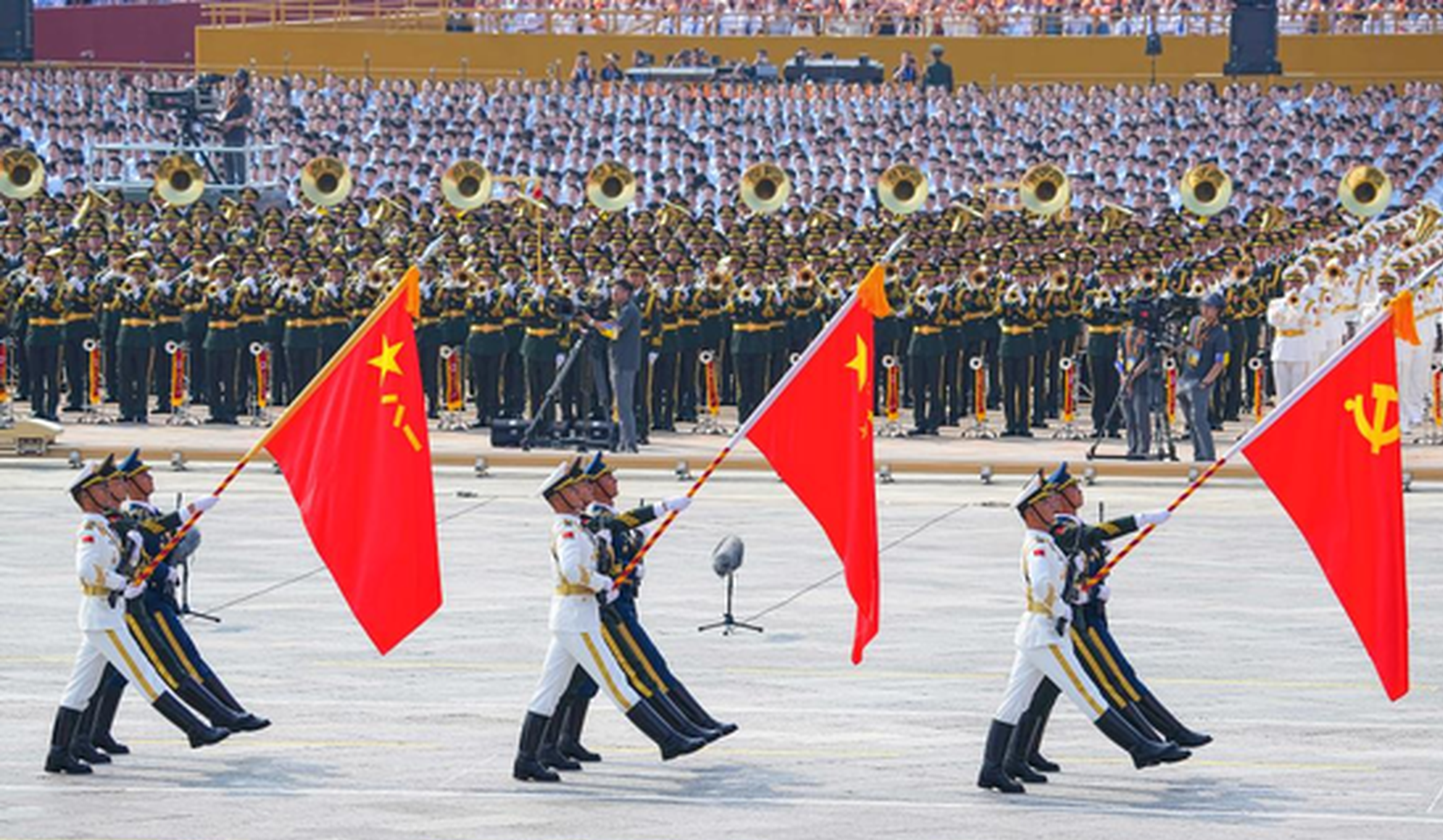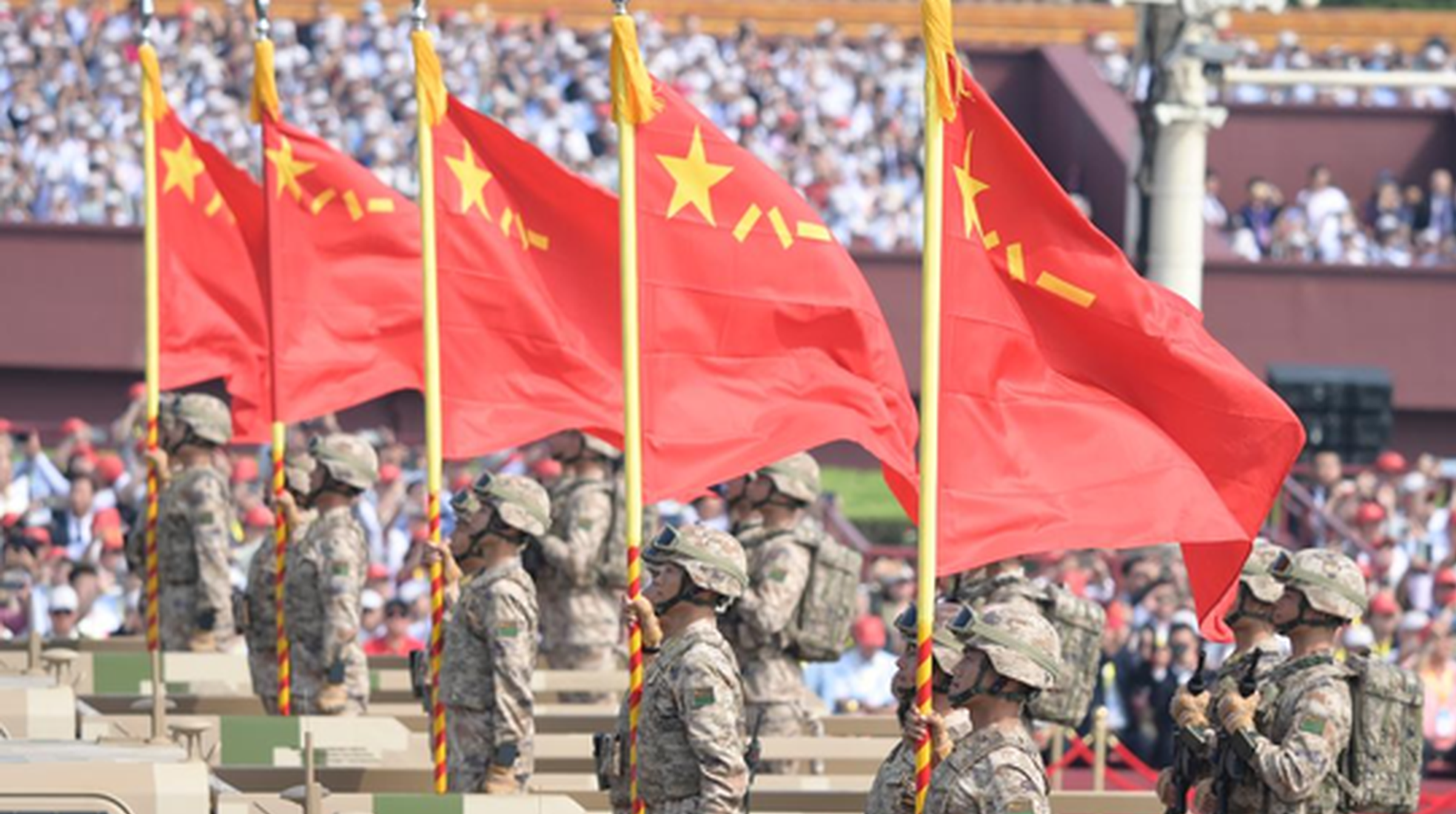 The People's Liberation Army (PLA) Guards of Honor formation marched through Tian'anmen Square in Wednesday's V-Day military parade, escorting flags of the Party, the nation and the PLA.